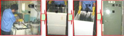 作業(yè)步驟: 1、所有的作業(yè)人員必須經(jīng)過GP相關(guān)知識的培訓(xùn);定期對制程中有無使用有害物質(zhì)、有無使HSF料件受污染進(jìn)行評估(通過委外檢測的方法,每年不少于一次);確認(rèn)設(shè)備、工具、物料、輔料有無環(huán)保標(biāo)識,有無變化;物料名稱及編號是否與批產(chǎn)品用料清單一一對應(yīng)。 2、將拉好絲的不銹鋼板放到堿處理池中進(jìn)行脫脂處理,浸泡30S后用海綿輕輕擦洗鋼板表面,以保證鋼板表面沒有油漬臟污。 3、將脫脂后的不銹鋼板,掛在掛具上放到鹽酸處理池中浸泡30S,進(jìn)行酸處理。 4、酸處理完的鋼板統(tǒng)一放在板架上,浸泡在清水中30S,進(jìn)行清洗,然后放在設(shè)定溫度為100度的烤箱內(nèi)進(jìn)行烘烤20分鐘,直到鋼板表面完全沒有水漬為止。